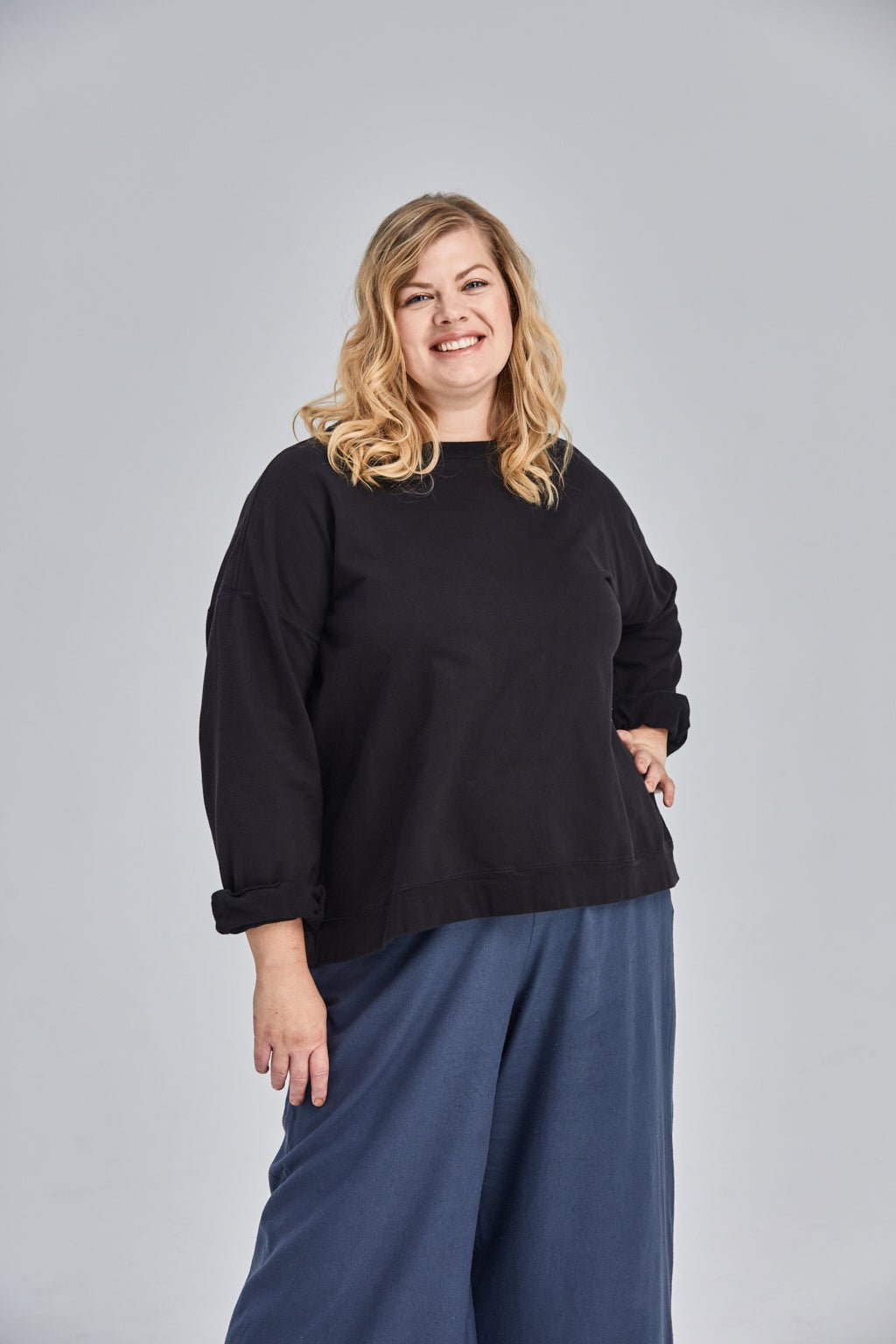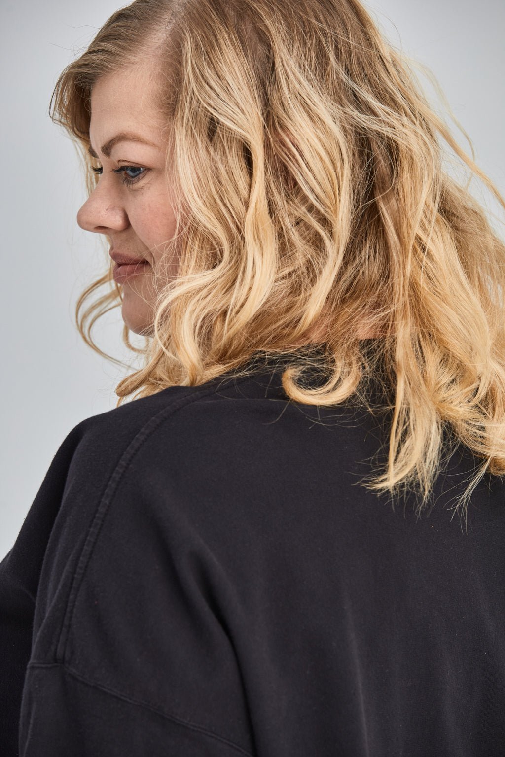 Janice is wearing a size 3XL, Extended Length in the Heavy Weight T Sweater. She is 6’0” Tall with a 51.5” Bust, 53.5” Waist, and 57” Hip. Her Arm Length measures 28 1/2” and Bicep 19 3/5”.