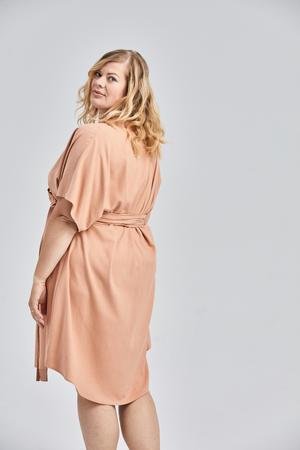 Jessica (in Blush) is wearing a size 2XL. She is 5' 10” Tall with a 48” Bust, 41” Waist, and 50” Hip. Her Arm Length measures 24” and Bicep 17”.