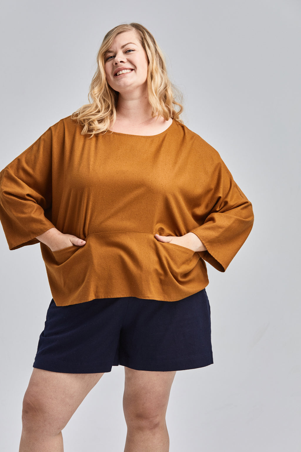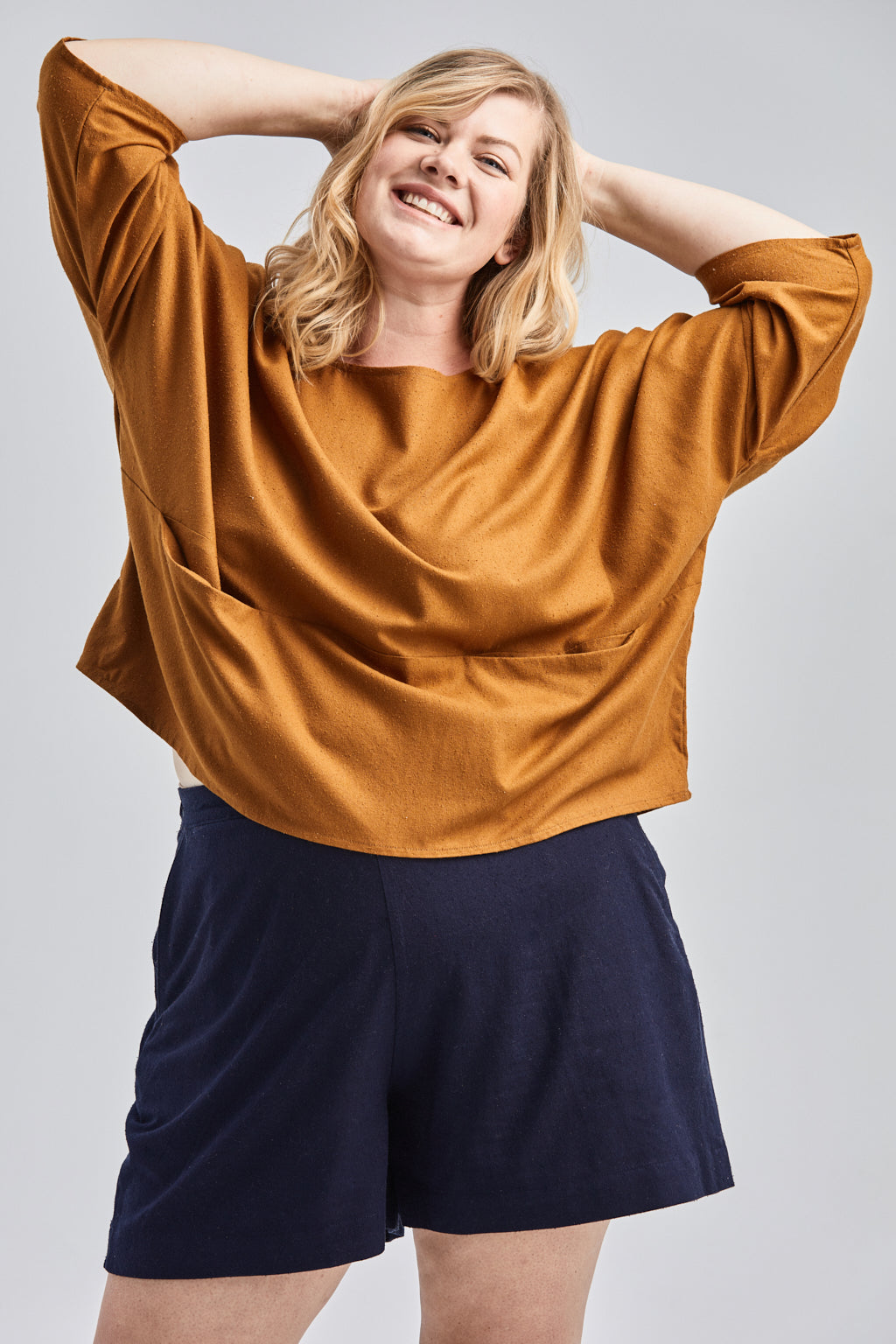 Jessica (in Blush) is wearing a size 2XL. She is 5' 10” Tall with a 48” Bust, 41” Waist, and 50” Hip. Her Arm Length measures 24” and Bicep 17”.
