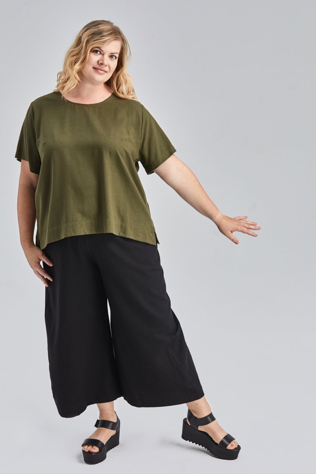 Jessica (in Olive) is wearing a size 2XL. She is 5' 10” Tall with a 48” Bust, 41” Waist, and 50” Hip. Her Arm Length measures 24” and Bicep 17”.