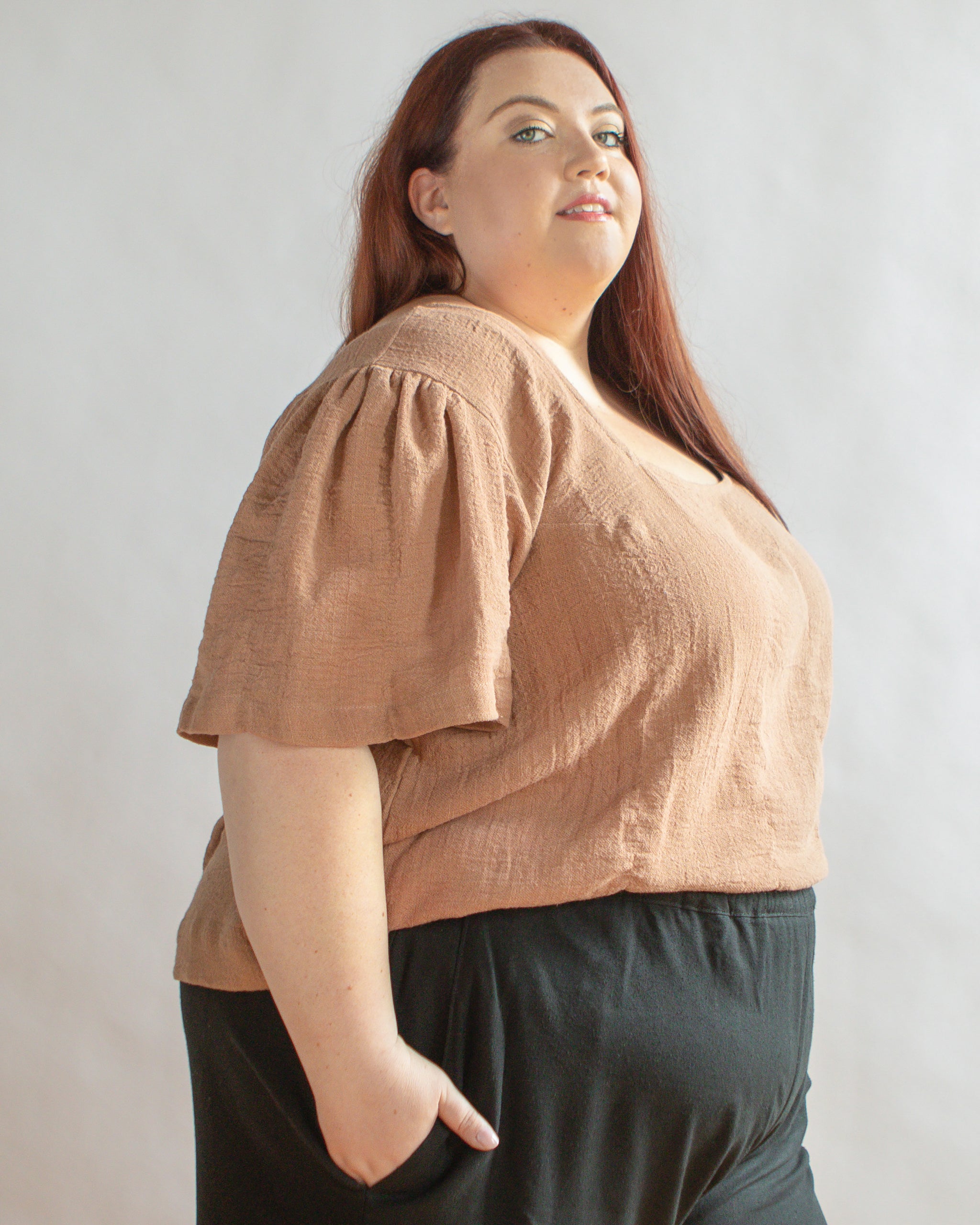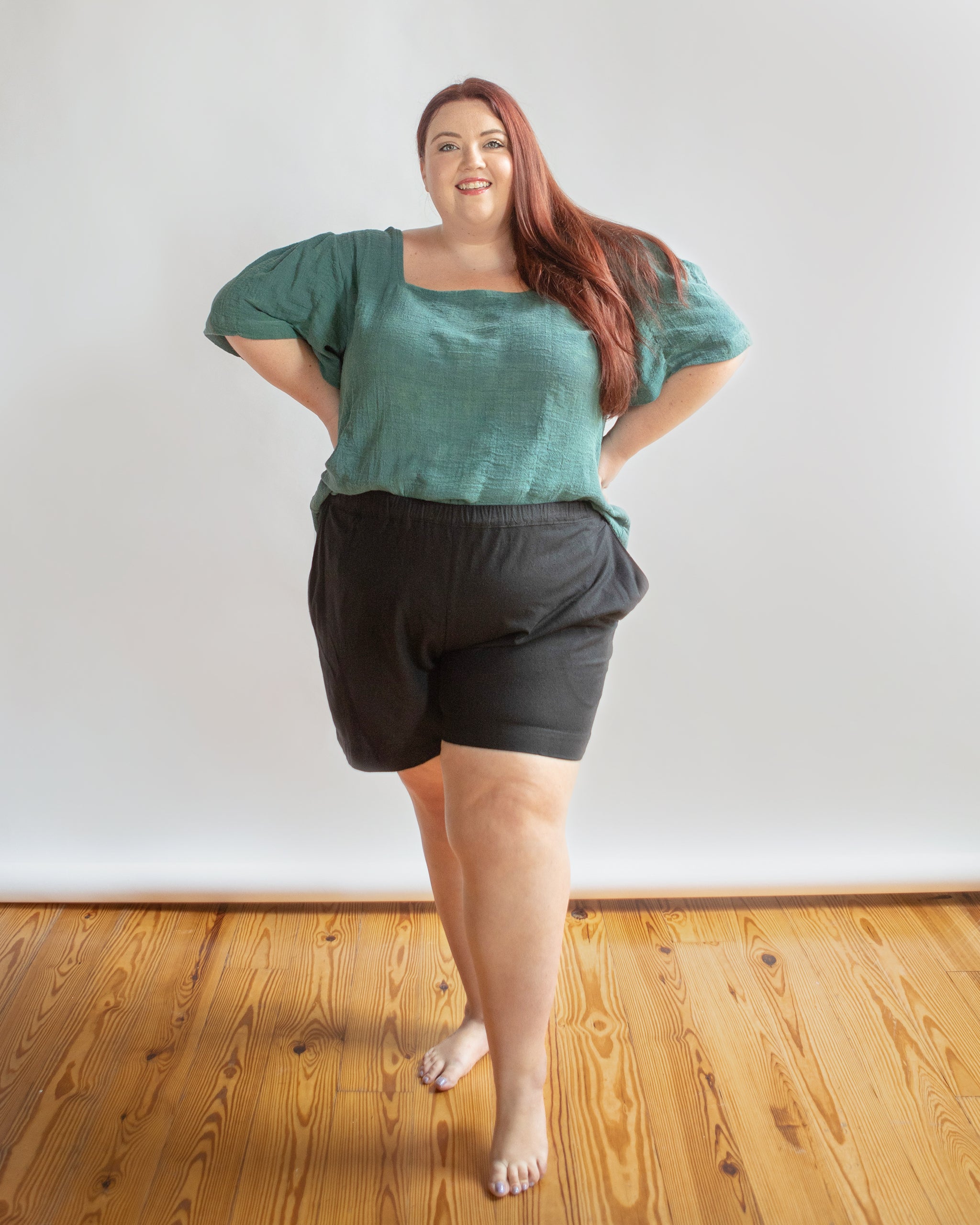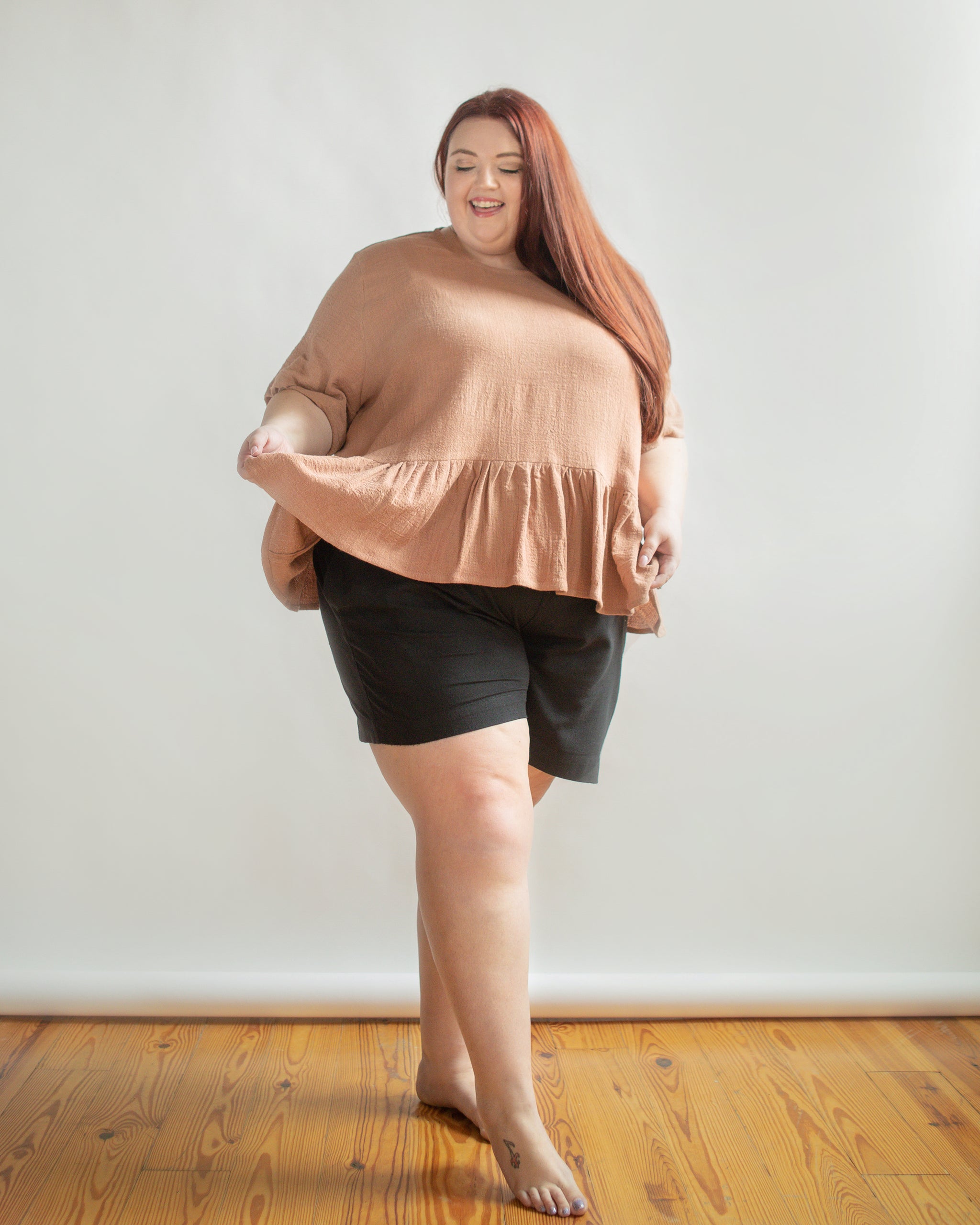 Janice is wearing a size 3XL, Extended Length in the Heavy Weight T Sweater. She is 6’0” Tall with a 51.5” Bust, 53.5” Waist, and 57” Hip. Her Arm Length measures 28 1/2” and Bicep 19 3/5”.